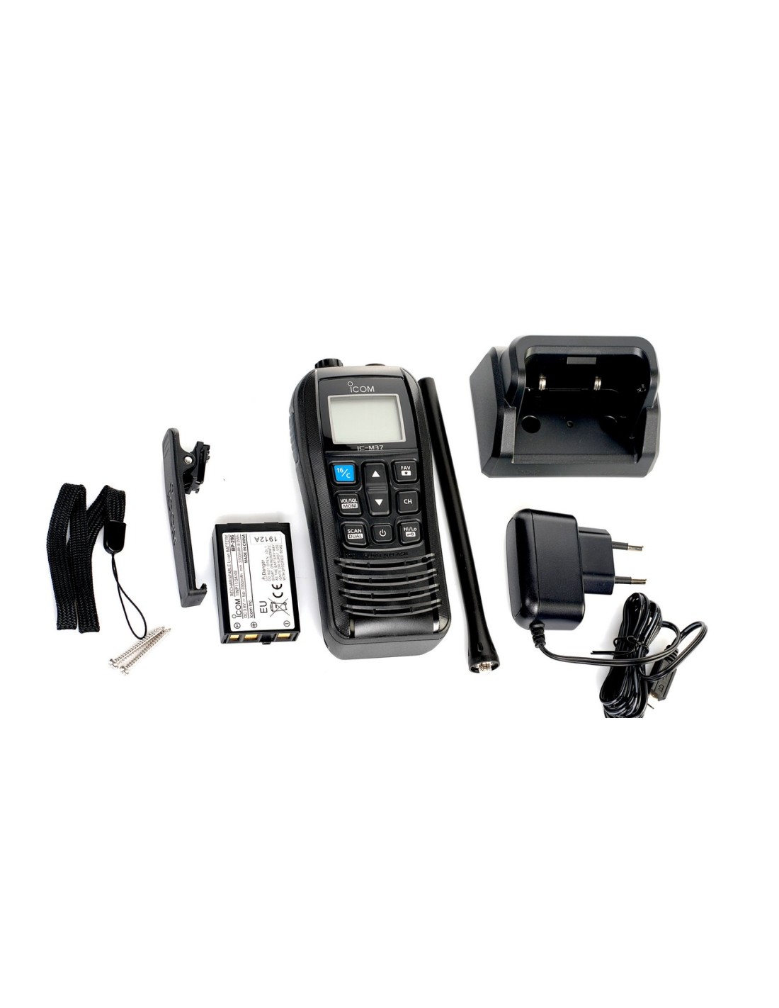 Delivery IC-M37E portable radio, FA-SC59V antenna, BP-296 battery, BS-235 desktop charger, MB133 belt clip and wrist strap