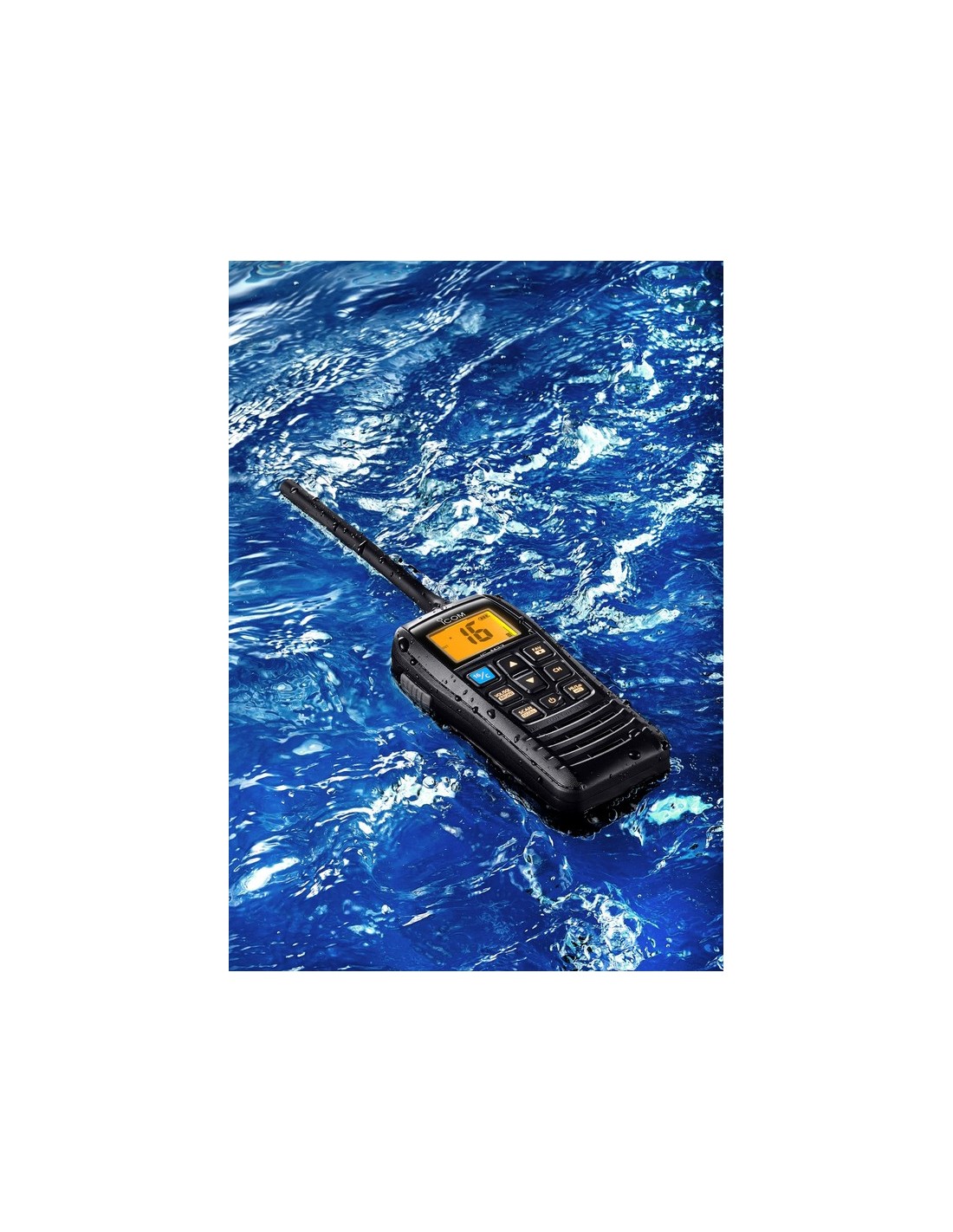 The IC-M37E portable VHF radio impresses with its comfortable handling, flat design, large buttons and excellent sound quality. Its low-power circuitry allows for more than 12 hours of operation, and the channel history function stores the last five channels for easy redialing. In addition, the radio is waterproof to IP57 (30 minutes at a depth of 1 metre) and floats.