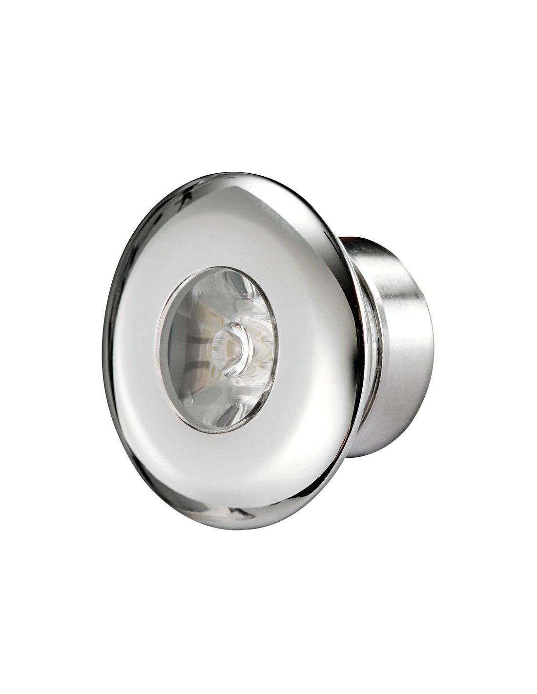 In acciaio inox micVrofuso lucidato a specchio. Lente in policarbonato. Montaggio a pressione.