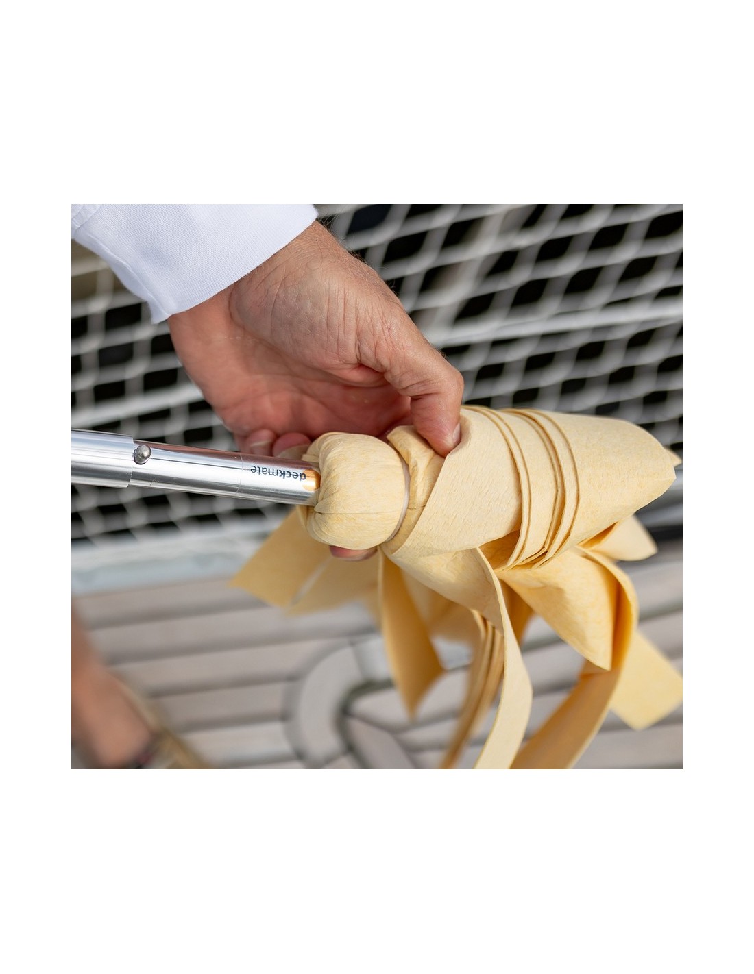 Il mop per l'asciugatura si monta facilmente su un manico deckmate con l'aiuto del sistema di sgancio rapido. Il mop annodato a mano è composto da 18 strisce di materiale PVA da 42 mm, dotate di un connettore in alluminio anodizzato lucido, con un pulsante a molla in acciaio inossidabile. Il tappo in gomma sul fondo del connettore impedisce al connettore di danneggiare la coperta.